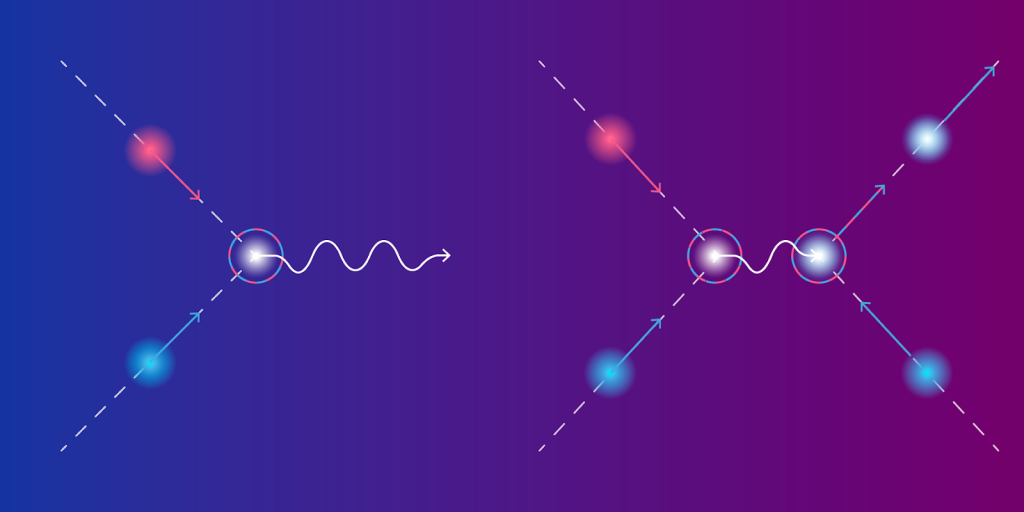 Схематическое изображение двух сценариев исчезновения частицы-электрона (синий) и античастицы-дырки (красная) в графене. В процессе излучательной рекомбинации (слева) энергия, выделяющаяся при взаимном уничтожении, улетает в виде порции света — фотона. При оже-рекомбинации (справа) эту энергию подхватывает пролетающий мимо электрон. Оже-процесс губителен для полупроводниковых лазеров, так как забирает на себя энергию, которую можно было бы высвободить в свет. Долгое время считалось, что оже-процесс в графене запрещён законами сохранения импульса и энергии