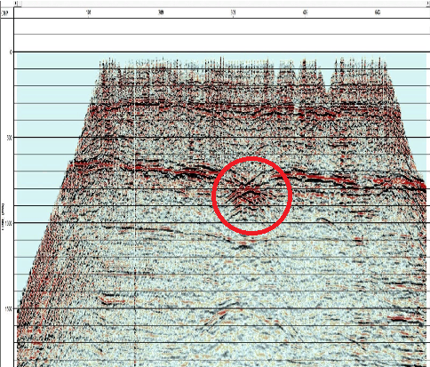 Пример артефакта, возникающего на сейсмических данных в ходе обработки. Он может быть спутан с нефтегазовой ловушкой. А при бурении скважины в этом месте может ничего не оказаться