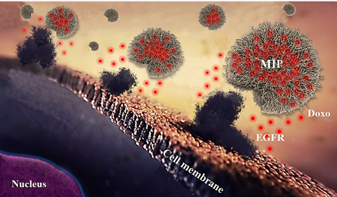 Синтез полимерной наночастицы происходит в присутствии молекулы-мишени, что приводит к образованию в nanoMIP «отпечатков» молекулы-мишени. Этот процесс можно сравнить со снятием форм для отливки, при которой конечный материал сохраняет очертания модели. Называется он импритингом. При этом полученные «формы» приобретают способность специфично распознавать и связывать молекулу-«мишень». В проведенном исследовании в качестве мишени был выбран тирозин-киназный рецептор EGFR (epithelial growth factor receptor — рецептор эпидемального фактора роста). Его повышенное присутствие наблюдается в широком спектре опухолей — от колоректального рака, рака легкого, наиболее агрессивной формы рака молочной железы, трижды негативного РМЖ, до опухоли мозга. Именно в силу этих факторов EGFR стал одной из первых мишеней для противоопухолевых препаратов на основе антител. В данной работе наночастицы были получены методом двойного импринтинга против двух молекул мишеней — линейного эпитопа («эпитоп» — участок мишени, который узнается антителом при связывании) EGFR и цитотоксического лекарственного препарата доксорубицина. Таким образом, конечный продукт одновременно может связываться с EGFR и оказывать терапевтическое воздействие за счет модификации доксорубицином.