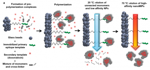 При этом для синтеза nanoMIP, способных специфично распознавать и связывать определенный белок, достаточно создать «отпечаток» не всей молекулы, а лишь ее небольшого участка. Этот короткий олигопептид ковалентно (т.е. с образованием химической связи) «пришивается» на стеклянные шарики, которые затем смешиваются с мономерами акриламида и доксорубицином. Стоит отметить, что полиакриламид, в отличие от собственных мономеров, является биологически безопасным материалом, который используется, например при производстве мягких контактных линз. При увеличении температуры происходит полимеризация мономеров, и формируются наночастицы размером от 100 до 200 нм с молекулярным «отпечатком» белка-мишени и включенным в них доксорубицином. Непрореагировавшие мономеры и неспецифичные наночастицы отмываются, в то время как синтезированные «пластиковые антитела» остаются связанными со стеклянными шариками.