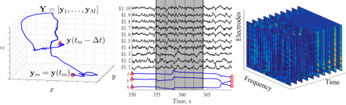Для каждого электрода интервал снимаемого сигнала длительностью в одну секунду претерпевает преобразование и получает признаковое описание в амплитудно-частотном пространстве, амплитуда показана цветом. Слева показана траектория движения конечности, в центре сигналы с электродов, справа признаковое описание. Предоставлено авторами исследования