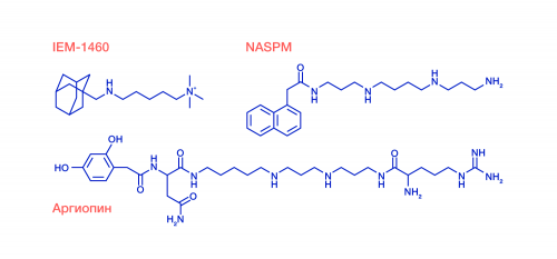Исследователям удалось изучить молекулярную структуру комплекса глутаматного рецептора с тремя блокаторами, включая природный токсин аргиопин из яда паука-кругопряда Argiope lobata и два искусственных соединения. Химическая формула всех трех блокаторов состоит из двух частей: «головы», напоминающей остаток ароматической аминокислоты, и «хвоста» различной длины, включающего аминогруппы, соединенные алифатическими углеводородными линкерами. Наблюдения производились с помощью метода криоэлектронной микроскопии, за развитие которого в 2017 году была присуждена Нобелевская премия Жаку Дюбоше, Иоахиму Франку и Ричарду Хендерсону.[/columns]