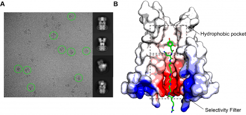 Структура комплекса глутаматного рецептора и токсина паука Argiope lobata – ацилполиамина аргиопина. (A) Микрографическая картинка, полученная с помощью криоэлектронной микроскопии, где изображения нескольких молекулярных комплексов обведены для примера зелеными кругами (слева), и примеры усредненных изображений молекулярных комплексов (справа). (B) Структура поры ионного канала рецептора с молекулой аргиопина внутри. Рисунок предоставлен Эдвардом Твуми, бывшим студентом лаборатории А. Соболевского, ныне сотрудником Гарвардского университета.