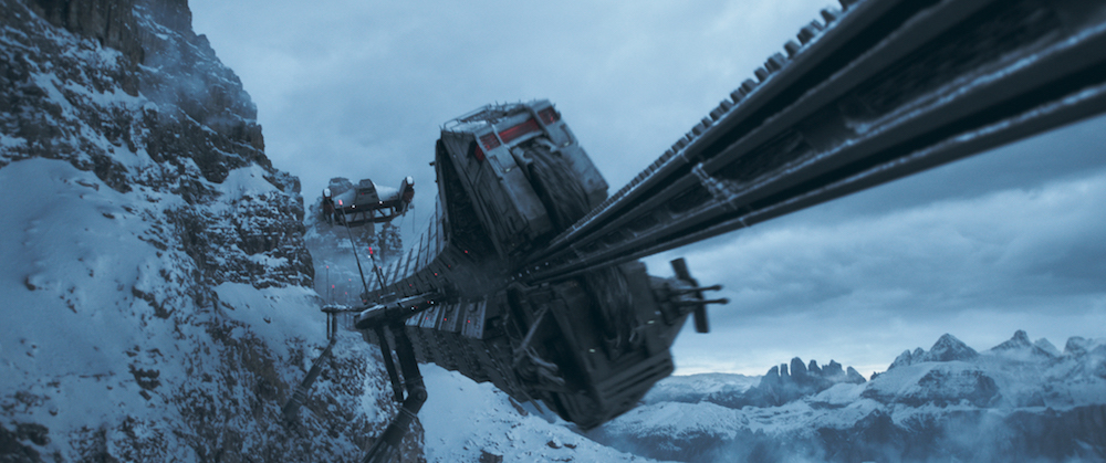 Герои фильма пытаются выкрасть коаксиум из поезда, вагоны которого располагаются и сверху и снизу рельс. Часть пути огибает скалу, и состав движется по ней на высокой скорости. Когда поезд преодолевает крутые повороты, то наклоняется под неестественно большим углом.
