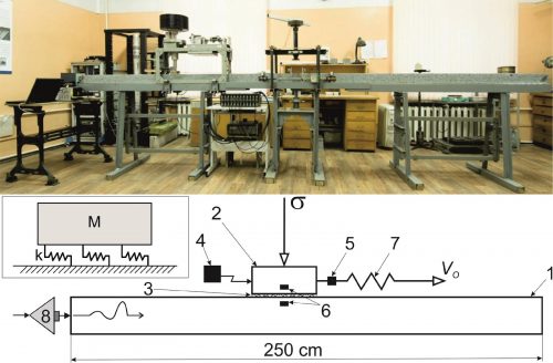 [columns size=»2/3″ last=»false»]Рисунок. а) Схема опытной установки: гранитный блок массой в полкилограмма перемещался по поверхности гранитного стержня 10х10х250 см, а установленный в торце стержня динамик создавал аналог сейсмических колебаний, распространяющихся в земной коре. b) На графиках видно, что блок двигался периодическими рывками, и это происходило при достижении критического значения механического напряжения. Разные линии соответствуют разным условиям опыта: контакт между гранитным блоком и стержнем мог быть заполнен как кварцевым песком, так и смесью песка с глиной[/columns]