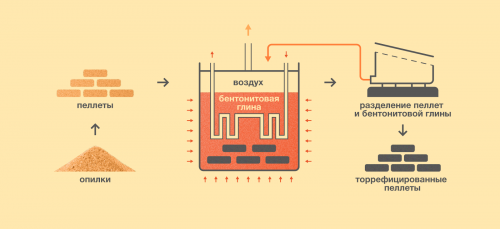 Для преодоления отмеченных выше проблем российскими учеными разработана совершенно новая технология переработки биомассы. Для ее реализации не требуется использование большого количества инертного газа, что заметно улучшает ее экономические и экологические показатели. Сущность данной технологии состоит в следующем. Древесные пеллеты или брикеты в реакторе засыпаются слоем минерального наполнителя. В качестве такого наполнителя может выступать бентонитовая глина, тальк или мел. Все эти компоненты химически устойчивы и относительно недороги. Далее реактор нагревается, а сам процесс торрефикации проводится без использования инертного газа.