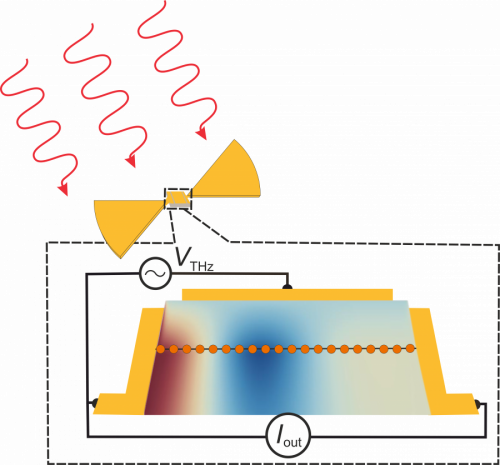 Фотография терагерцового детектора на основе графена. Терагерцовое излучение собирается антенной-бабочкой и фокусируется на слой графена в центре. В самом графене высокочастотный сигнал конвертируется в постоянный фототок Iout, который измеряется амперметром