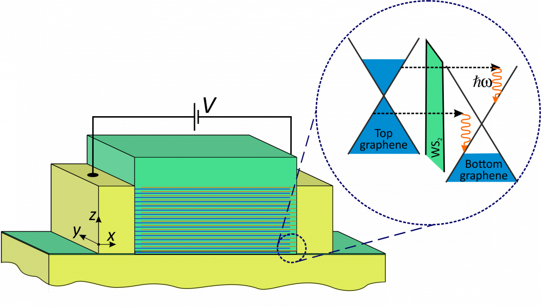 Принципиальная схема лазера на основе структуры «графен-диэлектрик-графен», использующей явление резонансного туннелирования. На вставке: энергетическая диаграмма туннелирования электрона между слоями графена с испусканием фотона