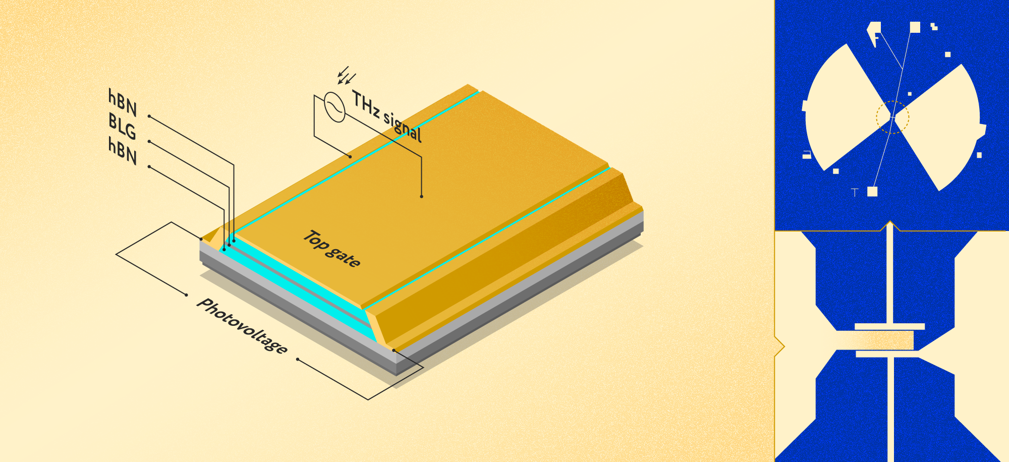 Нынешняя работа группы как раз представляет долгожданное решение проблемы резонансного детектирования терагерцовых волн. Созданный учеными фотодетектор представляет собой слой графена, подключенный парой контактов к терагерцовой антенне, с другой пары контактов считывается сигнальное напряжение. Слой графена играет роль резонатора для плазмонов. Ключевыми идеями, позволившими достичь резонанса, оказались «упаковка» графена между двумя кристаллами нитрида бора, использование двухслойного графена вместо однослойного, а также выверенные геометрические пропорции детектирующего элемента. В сэндвиче «нитрид бора — двухслойный графен — нитрид бора» примеси выталкиваются на края образца, давая путь для беспрепятственного распространения плазмонов. Двухслойность же графена открывает огромную свободу в электрической настройке скорости волн. С помощью напряжения на управляющем электроде (так называемом «затворе») авторам удалось вводить и выводить детектор из состояния резонанса, переключаясь между более чем десятью разными гармониками.