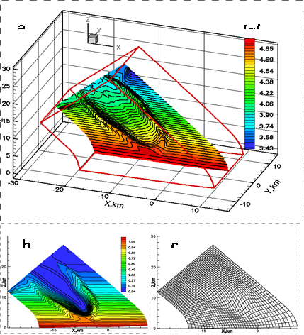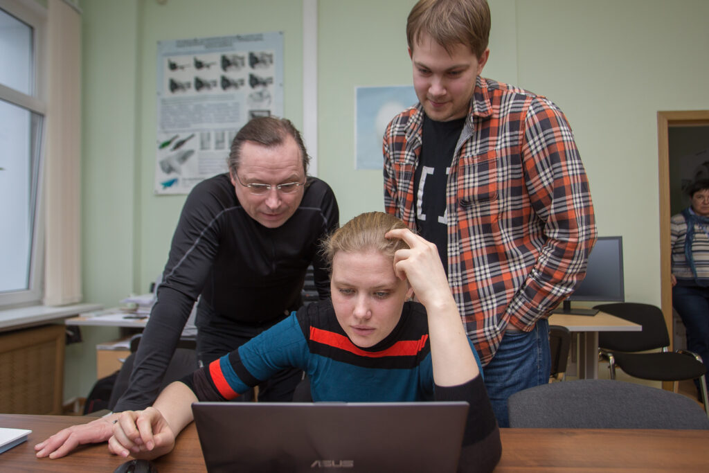 Владимир Гаранжа, Людмила Кудрявцева и Алексей Белокрыс-Федотов (слева направо) занимаются построением расчетных сеток вокруг тел сложной формы. В данный момент оценивает качество сетки, построенной с помощью разработанного ими метода.