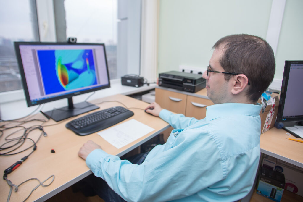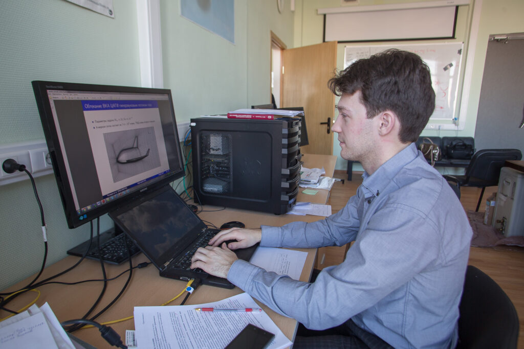 Заместитель заведующего лабораторией Владимир Титарев рассчитывает параметры обтекания спускаемого космического аппарата типа «Союз». Численное моделирование позволяет предсказать тепловые нагрузки на аппарат и правильно спроектировать теплозащитное покрытие.