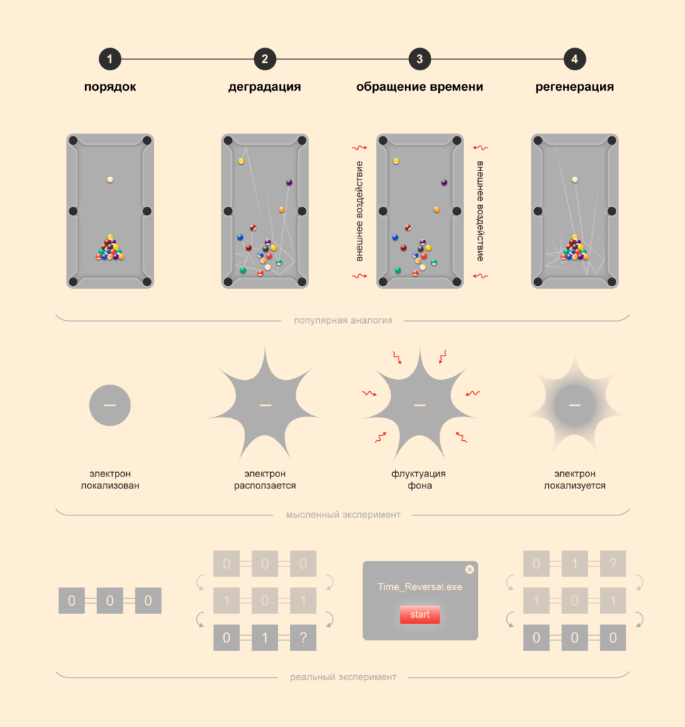 Четыре стадии реального эксперимента с квантовым компьютером повторяют аналогичные стадии мысленного эксперимента с электроном в космосе и фантастического примера с бильярдными шарами. Все три системы развиваются от порядка к хаосу, после чего их состояние внезапно меняется за счет точного внешнего воздействия и начинает развиваться в обратную сторону. Иллюстрация: @tsarcyanide, пресс-служба МФТИ