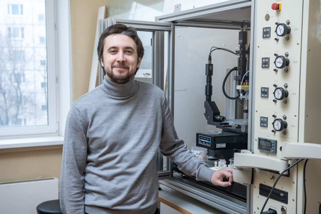 Дмитрий Ионов рядом с принтером для печати сенсорных материалов