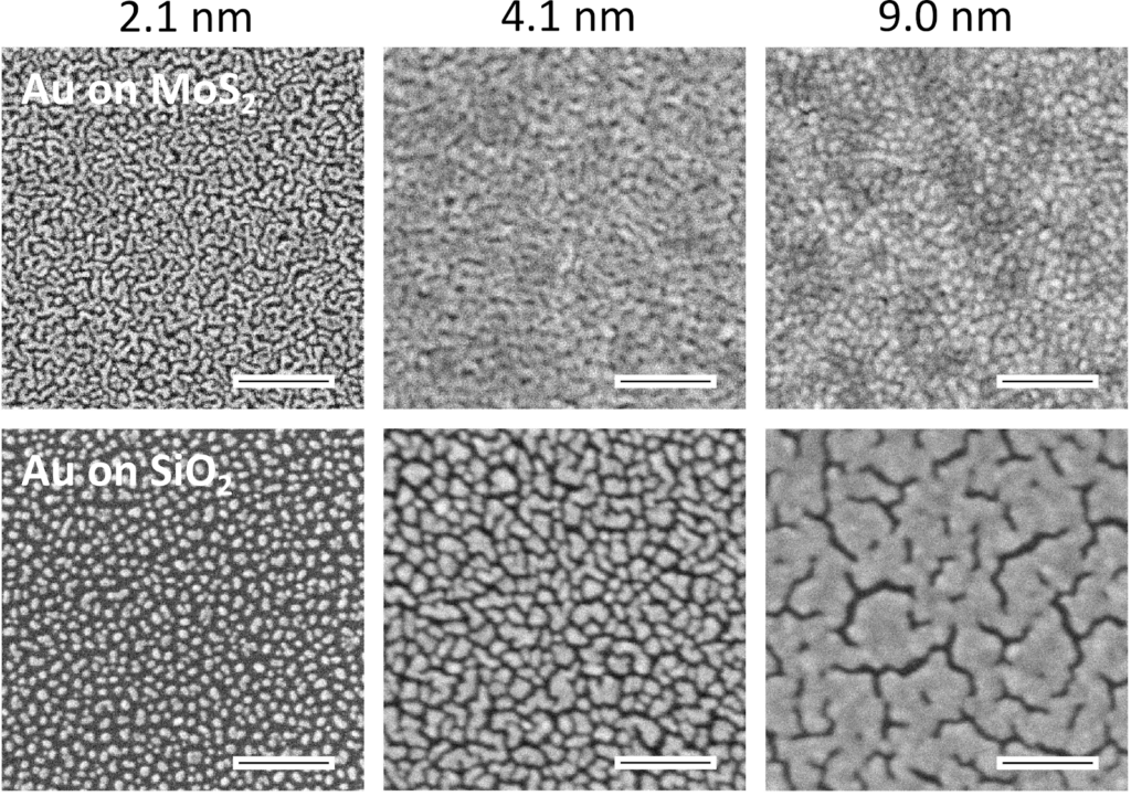 Рисунок 2. Электронная микроскопия золотых пленок разной толщины. Сверху — пленка на подложке из дисульфида молибдена (MoS2), снизу — пленка на кремниевой подложке со слоем диоксида кремния (SiO2). Предоставлено авторами исследования