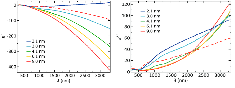Рисунок 3. Оптические свойства золотых пленок на монослое MoS2. Пунктирной линией обозначены свойства пленки толщиной 9 нм на чистой подложке SiO2. Отрицательное значение ε’ свидетельствует о проявлении металлической проводимости, а значение ε’’ определяет оптические потери подобно сопротивлению в электронике. Предоставлено авторами исследования