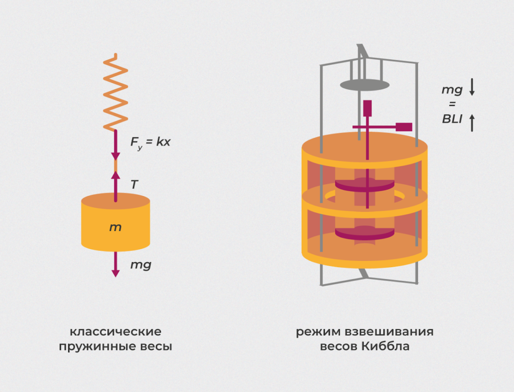 То есть с одной стороны мы имеем равенство сил Мg=BIL, c другой — соотношение U=BLv (закон индукции Фарадея). Итоговое уравнение после исключения произведения BL имеет вид: Mgv=UI. Размерность обеих сторон уравнения — единицы мощности, поэтому весы Киббла изначально назывались ватт-весами, а итоговое выражение сопоставляет электрическую и механическую мощности.