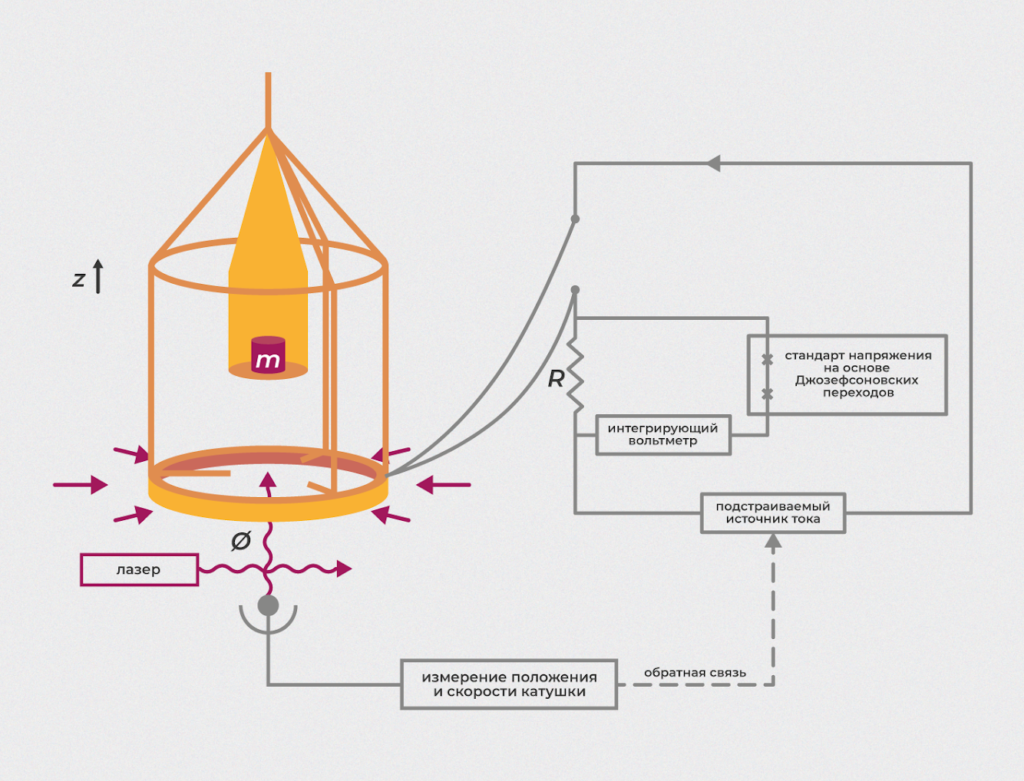 Необходимо будет немного преобразовать уравнение ватт-баланса так, чтобы в левой части была только масса, а в правой — все остальные величины. Напряжение представляется в виде U(n)= hf/2e, где n — квантовое число. Сопротивление, соответственно, R(p)=h/pe2. Электрическая мощность выражается через квантовые величины как UI=U*U/R=(hf/2e)2*h/pe2. Из уравнения баланса мощностей мы получим: m=p*n2*f2*h/(4gv).