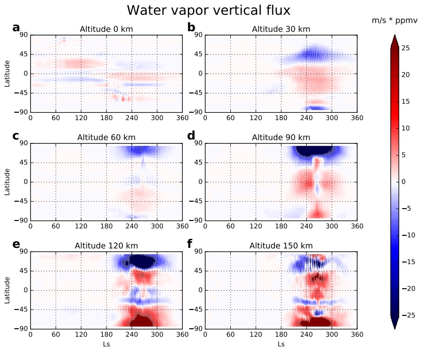 Согласно наблюдениям, количество атомов водорода, улетающих в космическое пространство, возрастает во время летнего солнцестояния в южном полушарии и при пылевых бурях. Причем колебания концентрации воды в верхних и нижних слоях атмосферы происходят одновременно. В связи с этим физики выдвинули гипотезу о существовании некого «насоса», «закачивающего» воду вверх и с помощью численного моделирования объяснили его природу.