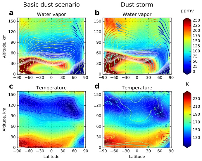 Рис. 3. Температура атмосферы и концентрация водяного пара в зависимости от высоты над поверхностью и географической широты. Стрелками показаны направления дующих ветров, толщина стрелки соответствует силе ветра. На рисунок 3с нанесены изотермы — линии, соединяющие точки с одинаковой температурой (обозначена числом на линии). На 3d число на изотерме показывает, насколько температура при пылевой буре отличается от обычной.