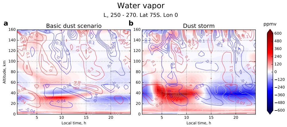 Также хорошо согласуются с моделированием результаты ночных измерений непосредственно перед началом глобальной бури (Ls = 200°÷250°) на высоте 40–50 км, показывая увеличение концентрации воды в нисходящем потоке водяного пара. Заметим, однако, что, согласно данным MRO, концентрация воды максимальна на высоте 40–50 км, модель же подразумевает убывание концентрации с высотой. Возможно, это следствие того, что распределение частиц пыли по размерам, заданное в модели, отличается от реального. Также модель предсказывает резкое падение содержания воды в атмосфере после Ls = 330°, что не находит подтверждения в экспериментальных данных.