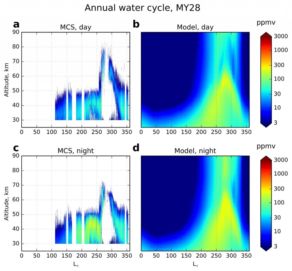 Для проверки адекватности модели авторы сравнили полученные результаты с данными, собранными Марсианским разведывательным спутником (Mars Reconnaissance Orbiter, MRO) в 28 марсианском году. И моделирование, и эксперимент показали увеличение концентрации воды в атмосфере во время перигелия (рис. 5). К сожалению, измерения, проведенные MRO непосредственно во время глобальной пылевой бури и на высотах, больших 80 км, оказались неудачными. Однако на наибольшей доступной для измерений этим аппаратом высоте, порядка 70–80 км, измеренные и вычисленные значения концентрации водяного пара оказались примерно одинаковы: 70÷80 см3/м3.