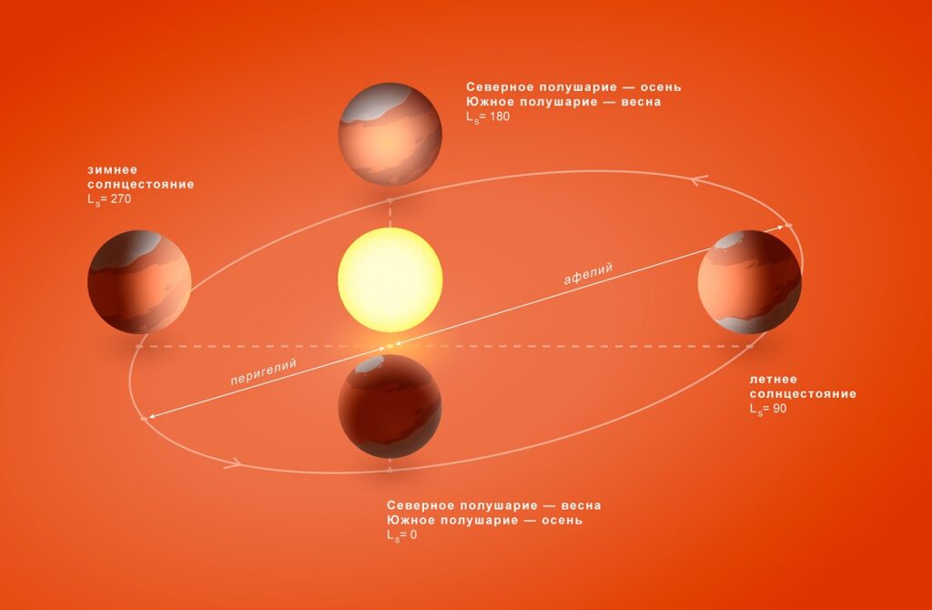 Солнечная долгота (Ls) — угол между воображаемыми прямыми, соединяющими Солнце и Марс во время весеннего равноденствия (Ls=0°) и в текущий момент. Ls от 0° до 90° соответствует весне в северном полушарии, 90°÷180° — лету, 180° ÷ 270° — осени, 270° ÷360° — зиме. Орбита Марса гораздо более вытянута по сравнению с почти круговой земной, лето в северном полушарии приходится на положение планеты в афелии (наиболее отдаленной от Солнца точке орбиты), лето в южном выпадает на прохождение перигелия (ближайшей к Солнцу точки). Поэтому «северное» лето гораздо холоднее «южного».