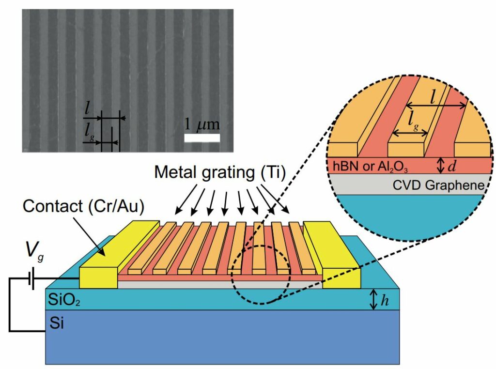 [columns size=»2/3″ last=»false»]Дальнейшей загадкой являлась частота резонансного возбуждения плазмонов, которая не соответствовала существующим теориям и имела принципиально другую зависимость от геометрических размеров решетки. Оказалось, что при близком расположении графена и решетки последняя модифицирует распределение поля плазмона и локализует его под металлическими штрихами, края которых играют роль зеркал для плазмонов. Авторы работы сформулировали простейшую теорию явления, используя аналогии с приближением сильно связанных электронов в твердом теле. Эта теория описывает экспериментальные данные без подгоночных коэффициентов и в дальнейшем может быть использована для оптимизации терагерцевых детекторов.[/columns]