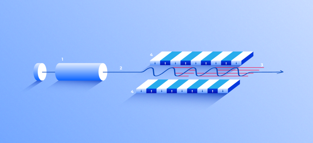Рисунок 1. Принцип действия лазера на свободных электронах. Источник (1) испускает свободные электроны (2), на больших скоростях (лишь в несколько десятков раз меньше скорости света) попадающие в ондулятор (4) — продольный тоннель с большим количеством магнитов. Воздействие магнитного поля вызывает колебания электрона по мере продвижения по тоннелю, что приводит к испусканию им рентгеновских квантов. В рентгеновском лазере происходит синхронизация движения электронов в ондуляторе, что приводит к генерации плотных, высокочастотных импульсов рентгеновского излучения, обладающих феноменальной яркостью. (3).