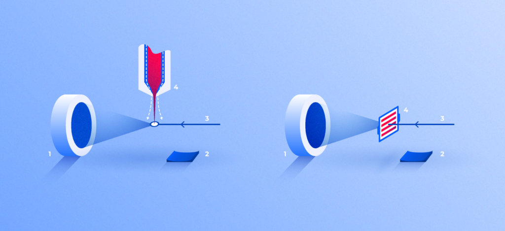 Также пришлось разработать особые методики подачи образца в камеру. Рентгеновские лазеры на свободных электронах обладают определенной максимальной частотой, с которой они могут излучать импульсы рентгеновского света. Для оптимизации работы по времени и затратам, необходимо подавать новый кристалл в рабочую камеру с такой же частотой. В настоящий момент разработано два принципиально разных подхода к решению этой задачи. В первом случае кристаллы попадают в камеру в виде жидкой суспензии, подаваемой через инжектор. Получающуюся на выходе из инжектора струю жидкости «обжимают» с помощью потока газа так, чтобы кристалл при пролете через лазерный луч оказался строго в его центре (рисунок 2, слева). Во втором случае кристаллы белка распределяют по прозрачной для рентгена подложке и автоматически подставляют следующий кристалл лазерному лучу перед импульсом (рисунок 2, справа).