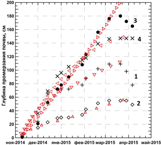Значения толщин мерзлого слоя почвы, измеренные и рассчитанные по модели для четырех исследуемых участков Кулундинской равнины (Алтайский край). Номер участка указан рядом с зависимостью, черные значки соответствуют измеренным значениям, красные треугольники — рассчитанным