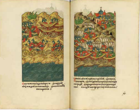 Скан Лицевого хронографа (Российская национальная библиотека, СПб). Перед штурмом Князем Олегом Царьграда (разворот листов 1086-1087)