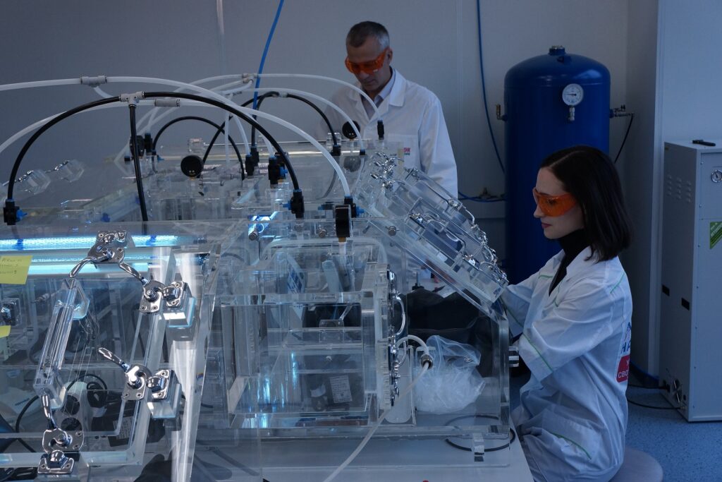 «Мы изучили различный опыт в этой области, и решили действовать нестандартным путем, исходя уже из собственного опыта в области технической физики. Вместо больших помещений, создание которых требует немалых средств, мы работаем через систему изолированных перчаточных боксов, в которых располагается необходимое оборудование. Главная проблема здесь была — создать внутри этих боксов особо чистую среду, в которой абсолютно отсутствуют биологические фрагменты из внешней атмосферы». Решение оказалось достаточно очевидным: из перчаточных боксов откачивается атмосфера и заменяется на особо чистый азот. Получается система, в которой генетический материал оказывается защищенным.