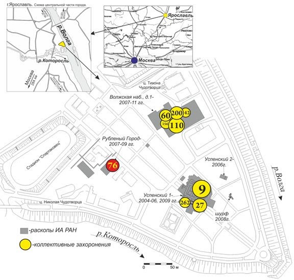 Схема расположения захоронений в Детинце Ярославля. Источник: ИА РАН