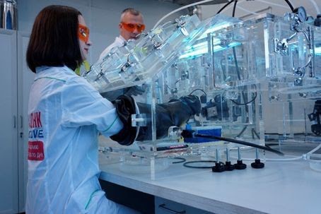 Пробоподготовка древних образцов, выделение ДНК. Работа в перчаточных боксах со средой из азота высокой чистоты. Источник: Лаборатория исторической генетики, радиоуглеродного анализа и прикладной физики МФТИ.