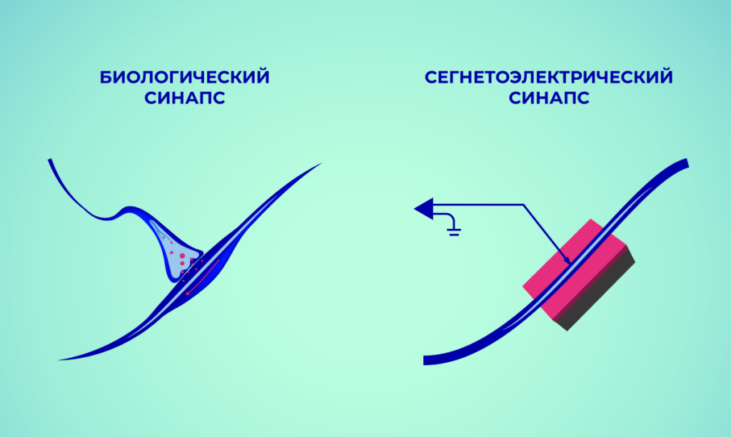 Слева изображен синапс из живого мозга — прообраз искусственного синапса (справа). Последний представляет собой мемристор, реализованный в виде туннельного сегнетоэлектрического перехода — тонкой пленки оксида гафния (розовый), проложенной между электродом из нитрида титана (синий) и кремния (серый). Кремниевый электрод одновременно играет роль подложки. Внешние электрические импульсы переключают состояния мемристора за счет изменения поляризации оксида гафния и, следовательно, его проводимости. Дизайнер: Елена Хавина, пресс-служба МФТИ