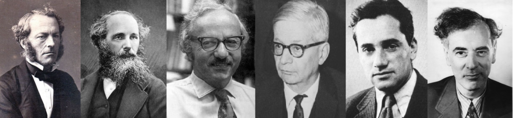 Фото ученых (слева направо): Джордж Габриель Стокс, Джемс Клерк Максвелл, Джордж Бернард Данциг, Рудольф Эрнст Пайерлс, Отто Фриш, Лев Ландау.