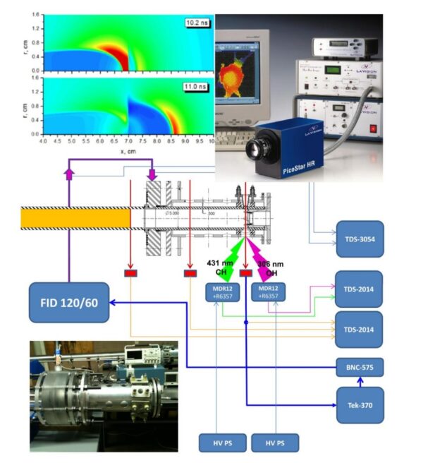 В своей работе ученые рассмотрели случай, когда стримерный разряд пересекает ударную волну. Исследователи изучали взаимодействие плазмы с ударной волной как экспериментально (рис. 2), так и с помощью численного моделирования одиночного пробоя. Он распространялся в 15-сантиметровом воздушном промежутке. Плотность модельного газа изменялась ступенчато от положительного электрода до отрицательного. Отрицательным электродом была плоская пластина, а положительным — пластина с иглой в центре, на кончике которой инициировался разряд. Ученые поднимали напряжение на зазоре за 1 наносекунду до 100 кВ, а затем оставляли постоянным на этом уровне. Распространение волны ионизации газа в самосогласованном электрическом поле происходило за счет лавинной ионизации газа на фронте волны и фотоионизации перед ней. Ученые наблюдали за поведением такой волны ионизации при пересечении границ областей газа разной плотности.