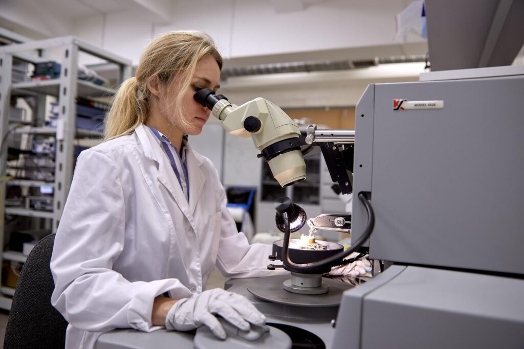 Научный сотрудник лаборатории топологических квантовых явлений в сверхпроводящих системах МФТИ Ольга Скрябина контролирует процесс микросварки контактов к чипу. Фотограф — Евгений Пелевин, пресс-служба МФТИ