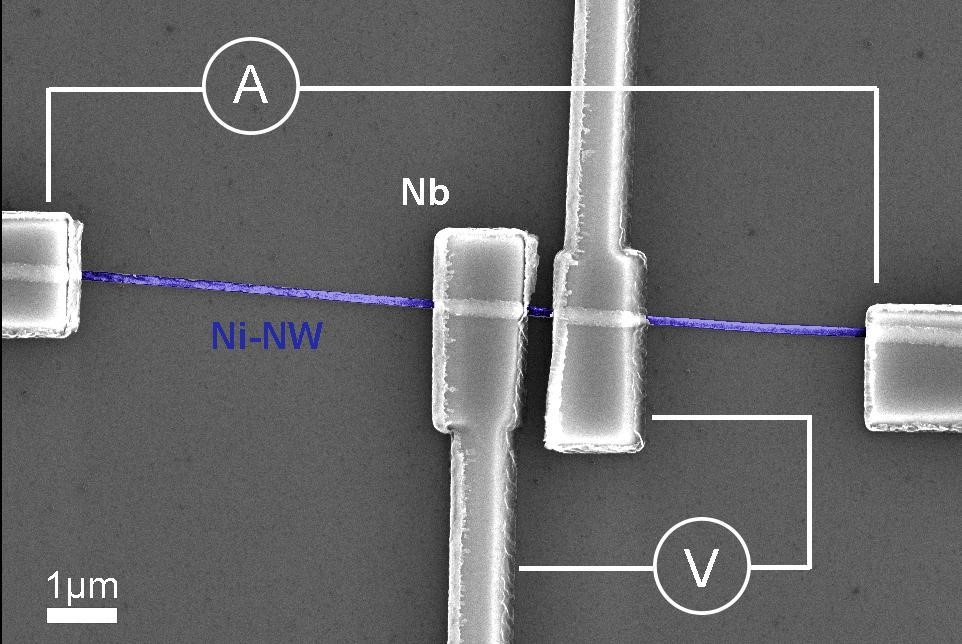 Микроизображение структуры. Серым в центре показаны сверхпроводящие электроды из ниобия, синим — ферромагнитный никелевый нанопровод. Метка шкалы составляет 1 микрометр. Буквами «A» и «V» (амперметр и вольтметр) обозначен способ пропускания тока через образец. Источник: O. V. Skryabina et al., Scientific Reports