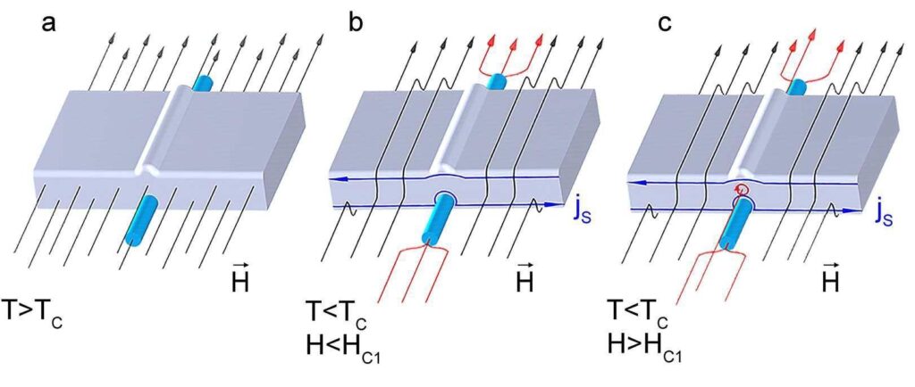 Процессы, происходящие в системе ниобий (серый блок) / никелевый нанопровод (синий цилиндр) при разных внешних условиях. (a) Температура выше критической, система находится в нормальном состоянии, магнитное поле (черные стрелки) проходит сквозь весь образец. (b) Температура ниже критической, при Hc < H < Hc1 магнитное поле концентрируется в ферромагнитном нанопроводе (красные стрелки) и экранируется ниобием (черные стрелки). (c) T < Tс, при превышении критического магнитного поля H > Hc1 происходит вход абрикосовского вихря в ниобий (отмечен красным кругом). Источник: O. V. Skryabina et al., Scientific Reports