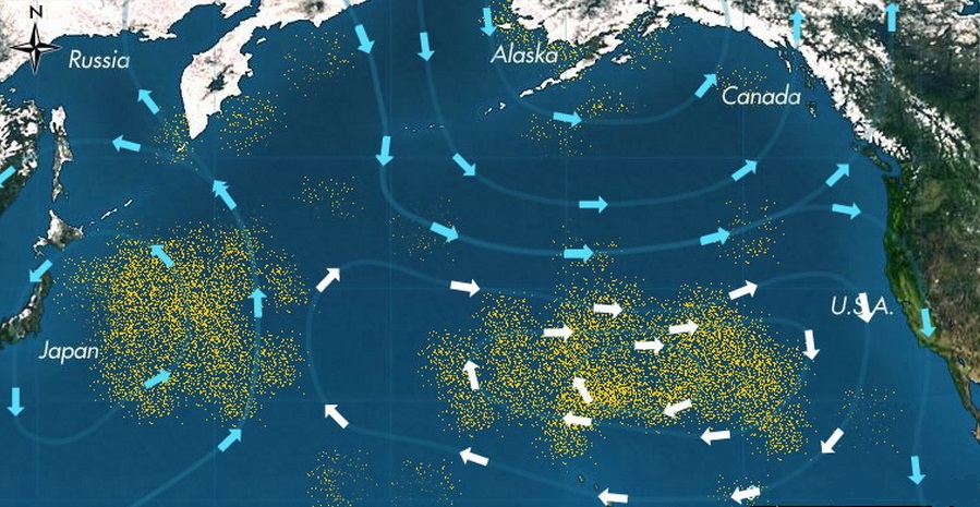 Водоворот Северо-Тихоокеанской системы течений сформировал сразу два мусорных острова. Источник: Eastern Garbage Patch/https://www.youtube.com/watchv=kfsYQhiWrdU