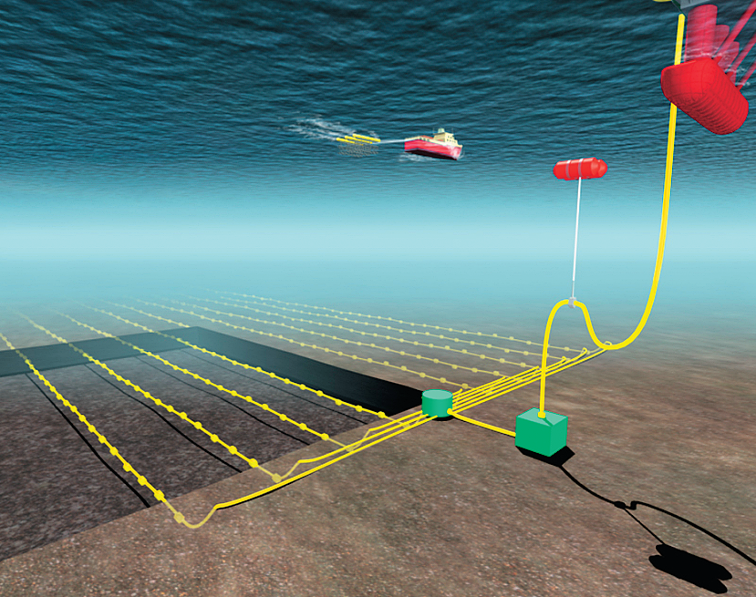 Технологии морской сейсморазведки не стоят на месте, а идут ко дну. На смену буксируемыми косам, то есть плавающим датчикам (рис. 1) приходят донные системы. На морском дне сигнал из недр регистрируется лучше. Для 4D-сейсморазведки идеально оставить датчики на дне, чтобы обеспечить повторяемость, поэтому предпочтительнее перманентные донные системы (рис. 2). Они не только обеспечивают более высокое качество мониторинга, но и удешевляют повторные съемки — остается только пригнать судно-источник.