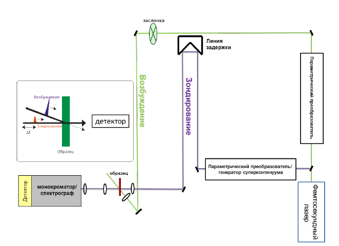 Вышеописанные методы не позволяют отдельно рассматривать энергетические переходы, разделенные очень малыми промежутками времени (порядка 10-12 секунд), — они сливаются, и в итоге непонятно, какие именно частицы находятся в «ловушке». Поэтому далее спектры исследовали с помощью метода возбуждения-зондирования (pump-probe spectroscopy).