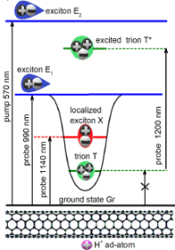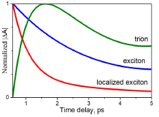 Обработка полученной этим методом информации позволила выделить энергетические уровни, формирующиеся через разное время после импульса (обозначены E1, X и Т, рисунок 3). Первые два соответствуют образованию экситона, свободного и пойманного в протонную ловушку (так как интенсивность X-полосы повышается при увеличении концентрации соляной кислоты). Третий формируется через заметное время (примерно одну пикосекунду) после формирования экситонных уровней, исходя из чего авторы связали его с образованием в «ловушке» новой квазичастицы, триона.