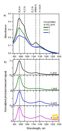 Спектры а) поглощения и б) фотолюминесценции нанотрубок в зависимости от концентрации соляной кислоты