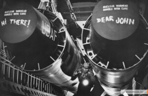 [columns size=»2/3″ last=»false»]Человечество, впрочем, может справиться с задачей самоистребления и без посторонней помощи. Один из ярких образов грозящих нам опасностей — Часы Судного дня, показывающие время до полуночи — глобального ядерного катаклизма. Сейчас на них 23.58, до этого стрелки достигали столь опасных отметок в 1953 году, когда СССР и США провели испытания термоядерных бомб. В 1964 году Стенли Кубрик в фильме «Доктор Стрейнджлав, или Как я перестал бояться и полюбил бомбу» задался вопросом — что если война начнется абсолютно беспричинно, например, один из американских генералов сойдет с ума и отправит ядерные бомбардировщики на СССР? Несмотря на сотрудничество советского и американского правительств, предотвратить катастрофу не удается — экипаж бомбардировщика с поврежденной системой связи не слышит сигнала отбоя и даже с поломкой бомболюка добросовестно выполняет свою работу, запуская тем самым систему ответного удара.[/columns]