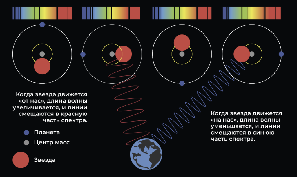 Однако есть способы обнаружить планету без прямого наблюдения, и тот из них, что использовали Майор и Кело, называется методом радиальных скоростей. Его суть заключается в том, что планета и звезда вращаются вокруг общего центра масс (то есть когда мы говорим, что Земля вращается вокруг Солнца, мы неправы). Получается, что звезда то приближается к нам, и тогда, согласно эффекту Доплера, ее свет для нас «синеет», то удаляется, «краснея».