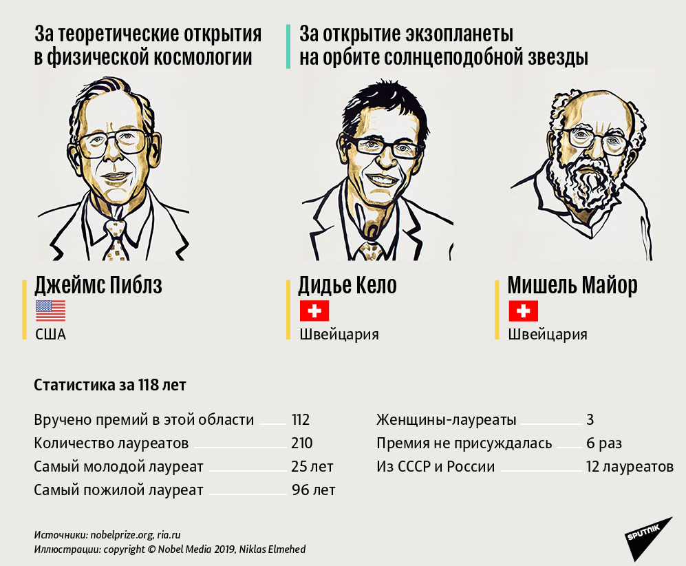 В 2019 году Нобелевскую премию присудили Джеймсу Пиблзу за теоретические открытия в физической космологии и Мишелю Майору с Дидье Кело за открытие экзопланеты. Космология и поиск экзопланет — довольно разные области знаний, поэтому нас заинтересовало, как обычно сочетаются тематики «двойных премий».