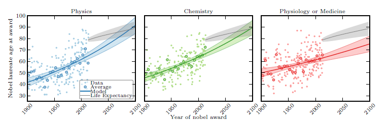 Средний возраст лауреатов и ожидаемая продолжительность жизни в США. Источник: Becattini, F., Chatterjee, A., Fortunato, S., Mitrović, M., Pan, R. K., & Parolo, P. D. B. (2014). The nobel prize delay. arXiv preprint arXiv:1405.7136