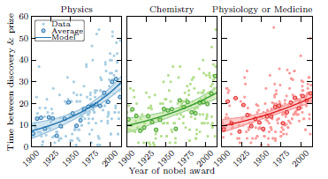 Ждать награды лауреатам пришлось долго — часть ключевых работ Пиблза написана еще в конце 60-х, Майор и Кело обнаружили экзопланету в 1995-м, но это не предел. Так, астрофизик Субраманьян Чандрасекар получил в 1983-м году премию за открытие, сделанное в 1930-м! В полушутливой статье «The Nobel Prize delay» группа ученых подсчитала, сколько в среднем времени проходит в ожидании и как этот промежуток меняется в зависимости от года вручения. Оказалось, что он неуклонно растет, причем для физиков быстрее, чем для химиков и медиков. Такими темпами средний возраст лауреатов в обозримом будущем будет превышать среднюю продолжительность жизни.